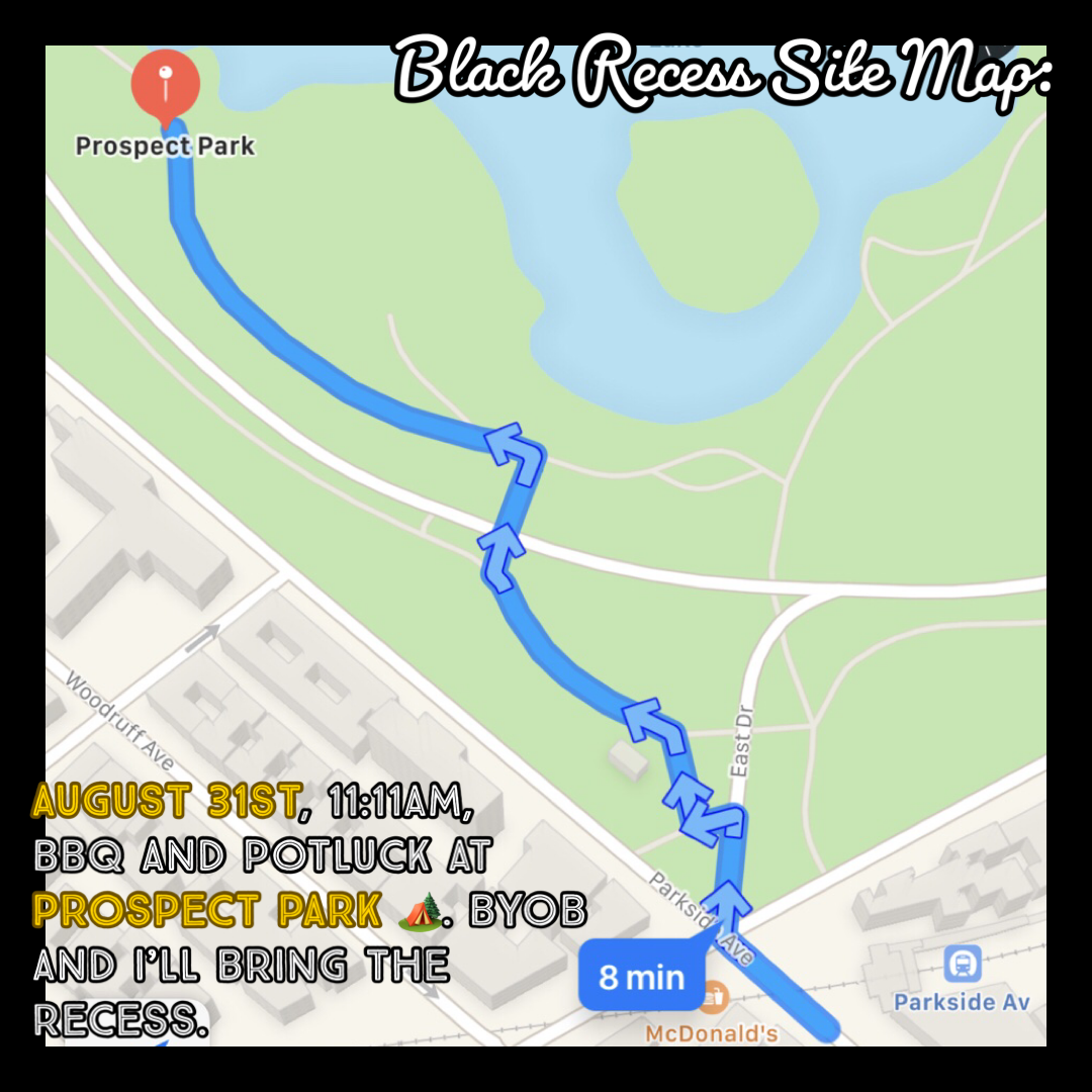 Black Recess© is a transferable event that can adapt to any space or location. In 2019, Black Recess© (vol. I-III) was hosted respectively at Jacob Riis Beach, Prospect Park, and my abode. Black Recess© also hosted its 1st annual Black Wellness Bazaar© in April 2021. This event was an intimate wellness fair and day retreat curated as a therapeutic gateway to heritage and healing. The Black Wellness Bizarre© sought to create a safe space where people of color did not need to conform to culturally insensitive societal standards.
